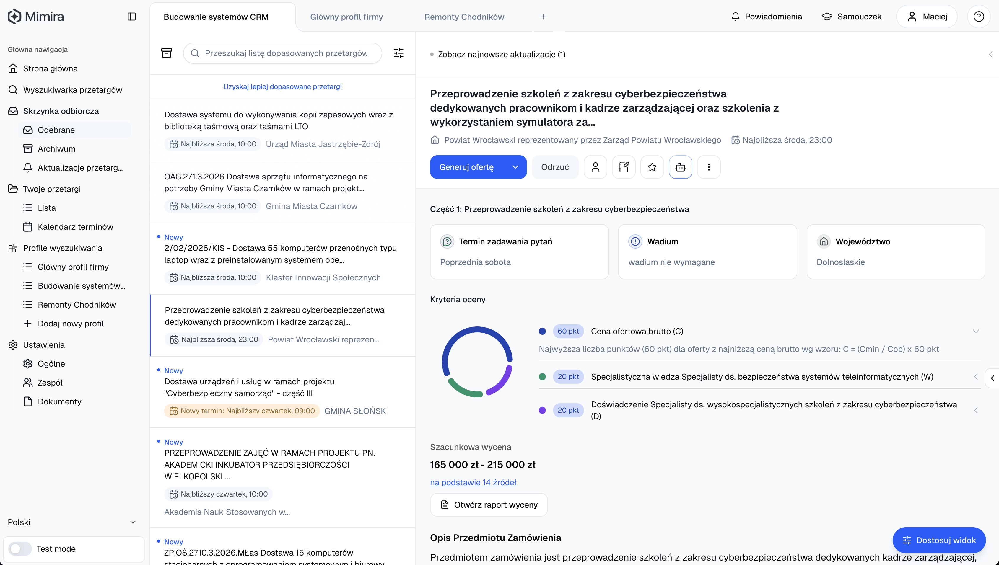 Mimira to innowacyjna platforma łącząca sztuczną inteligencję z wiedzą ekspertów ds. zamówień publicznych. Pomagamy firmom w kompleksowej obsłudze przetargów: od wyszukiwania odpowiednich ogłoszeń, przez ich analizę, aż po przygotowanie kompletnej dokumentacji ofertowej.